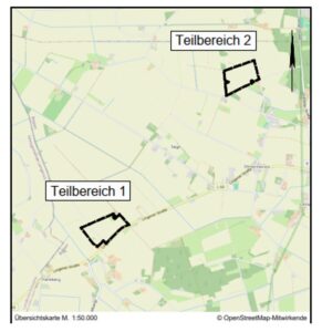 Das Plangebiet teilt sich in zwei Teilgeltungsbereiche, die eine Größe von ca. 17 ha, bzw. ca. 16 ha umfassen. Der Teilgeltungsbereich 1 befindet sich dabei im Westen des Ortskerns der Gemeinde Bippen im Ortsteil Ohrte, der Teilgeltungsbereich 2 nordwestlich der im Zusammenhang bebauten Ortslage Bippens im Ortsteil Ohrtermersch.