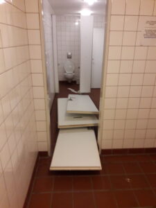 Vor längerer Zeit wurden bereits Seifenspender, Toilettenpapierhalter, Spiegel und Handtuchhalter von der Wand gerissen und zerstört.