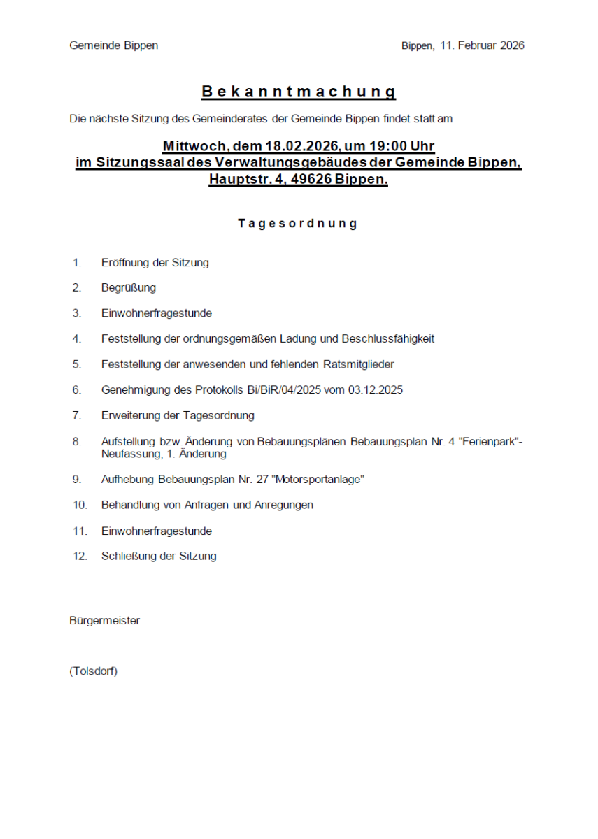 Die nächste öffentliche Ratssitzung der Gemeinde Bippen findet am 18.02.2026 um 19:00 Uhr im Sitzungssaal des Verwaltungsgebäudes der Gemeinde Bippen statt.