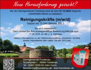 Die Samtgemeinde Fürstenau ist auf der Suche nach mehreren Reinigungskräften (m/w/d) für die Grundschule Fürstenau.
