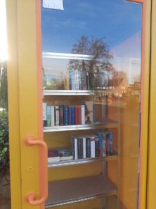 Die Telefonzelle / öffentlicher Bücherschrank steht direkt auf dem Dorfplatz neben der orangenen Bank und lädt alle Leserinnen und Leser zum Leihen und Tauschen ein.